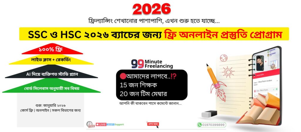 99 Minute Freelancing হলো একটি স্কিল–বেইসড Freelancing Training & Service Provider Institute, যা ২০১৭ সালের ৪ আগস্ট থেকে সফলভাবে কাজ করে যাচ্ছে। আমাদের লক্ষ্য একটাই— Passion কে Profession এ রূপান্তর করা