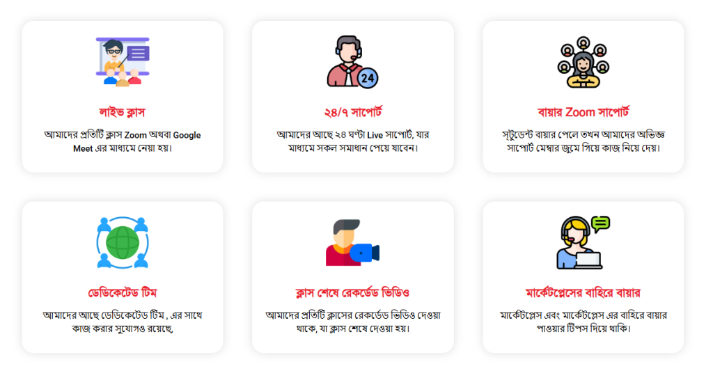 ➤ মার্কেট প্লেসের বাইরে কাজ পাবার বিশেষ ৪-৫ টি ক্ল… ➤ বায়ার পেলে জুম মিটিং-এ গিয়ে কাজ নিয়ে দিতে সাহায্য করে থাকি। ➤ ২৪ ঘন্টা লাইভ জুম সাপোর্ট প্রদান করে থাকে। ➤ টিম হয়ে কাজ করার সুযোগ সুবিধা রয়েছে। ➤ প্রতিটা ক্লাস শেষে রেকর্ড ভিডিও সিক্রেট গ্রুপে দেয়া হবে. সেই রেকর্ড দেখেও আপনি প্র্যাকটিস করতে পারবেন। ➤ কোর্স শেষে আমরা আপনাকে সার্টিফিকেট প্রদান করে থাকবো, যে সার্টিফিকেট দিয়ে আপনি যে কোন কোম্পানি তে একজন প্রফেশনাল ডিজিটাল মার্কেটার হিসেবে চাকরি করতে পারবেন বা অনলাইনে বিদেশি কোম্পানির সাথে রিমোট জব করতে পারবেন। ➤ আমাদের এখান থেকে পাবেন আজীবন সাপোর্ট।